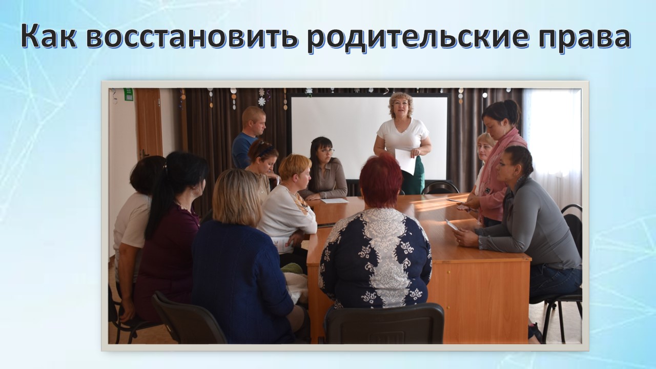 В связи с этим, в целях повышения уровня информированности родителей, имеющих намерение восстановить родительские права, специалистами отдела сопровождения замещающих семей структурного подразделения СМФЦ, ОГБУ «УСЗСОН по Аларскому району», проведен информационный час «Как восстановить родительские права?»