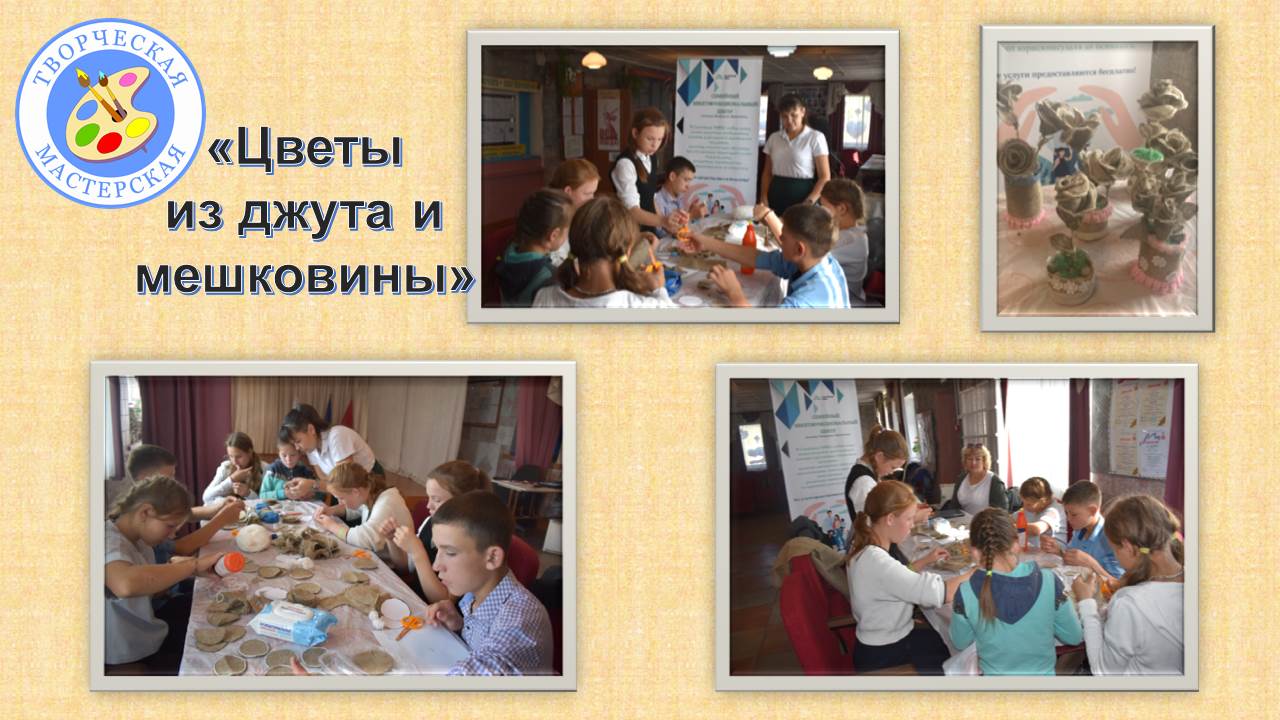 В течение трех занятий специалисты с детьми из замещающих семей изготовили удивительную красоту из мешковины и джута. В процессе изготовления цветов и вазы, дети и специалисты беседовали на темы: что заниматься творчеством сейчас модно и интересно, через творчество можно самовыразиться, какие технологии можно применять в работе по изготовлению цветов.